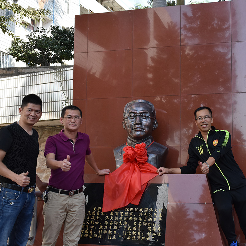 半身像由泥塑师傅雕刻泥塑模型后翻制玻璃钢产品,再由明磊雕塑师傅用紫铜切片锻打,然后拼接成型,整体满焊精工细磨后产品上色。半身像成品完成后由明磊雕塑专业安装团队现场安装。,陶行知雕像的摆放,能够勉励莘莘学子们学会学习,学做真人,从身边的小事做起,能够促使人们养成良好的学习习惯和行为习惯,争做合格的学生,以感恩之心回报父母、老师、学校和社会。